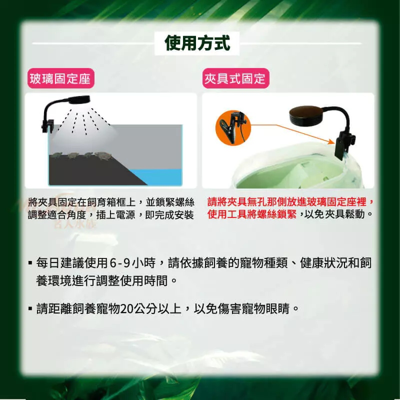 1.本產品為室內飼養兩棲爬蟲專用夾燈,請勿用於其他用途。