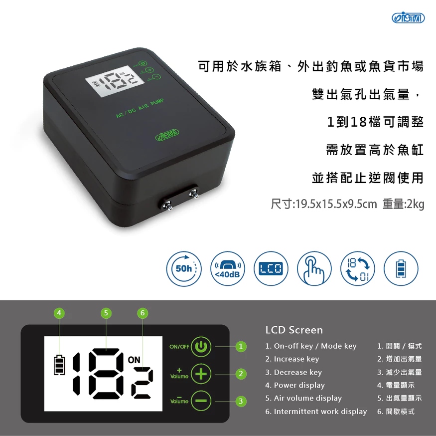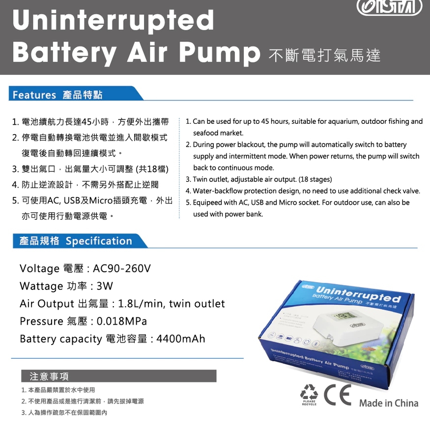 3.AC/DC兩用不斷電打氣幫浦,停電/來電時自動切換。
