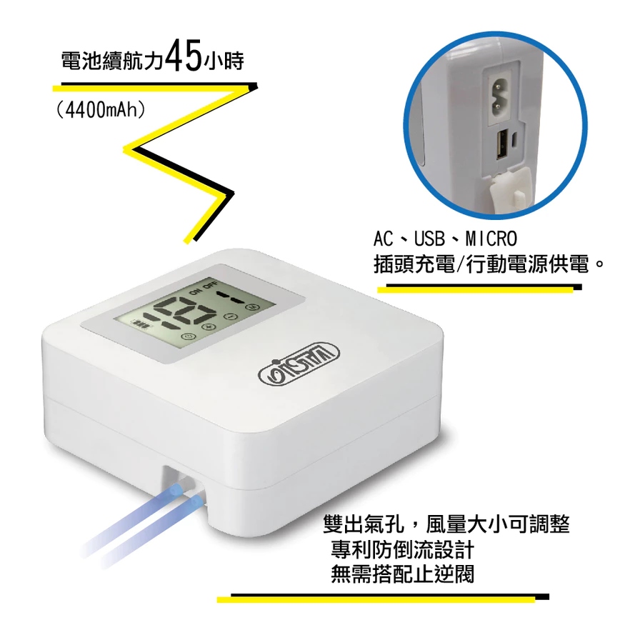 1. 電池續航力長達45小時供電並進入間歇模式, 復電後自動轉迴連續模式