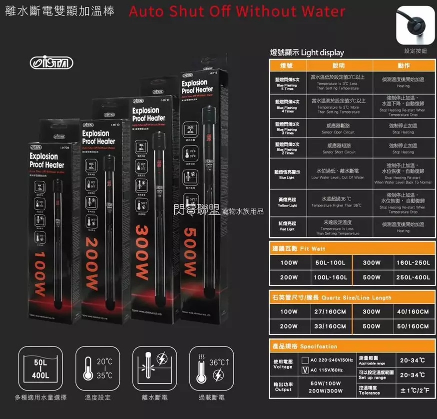 首頁 > > 【閃電聯盟】伊士達ISTA 離水斷電雙顯加溫棒100W/200W/300W/500W按鈕型 控溫 加溫器 魚缸加溫